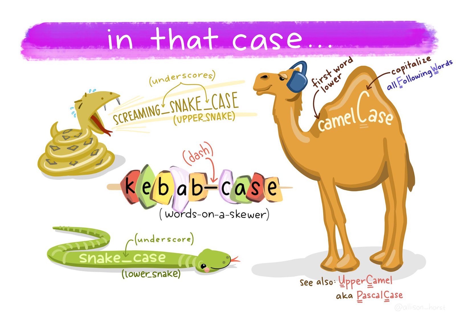 - Use snake case (