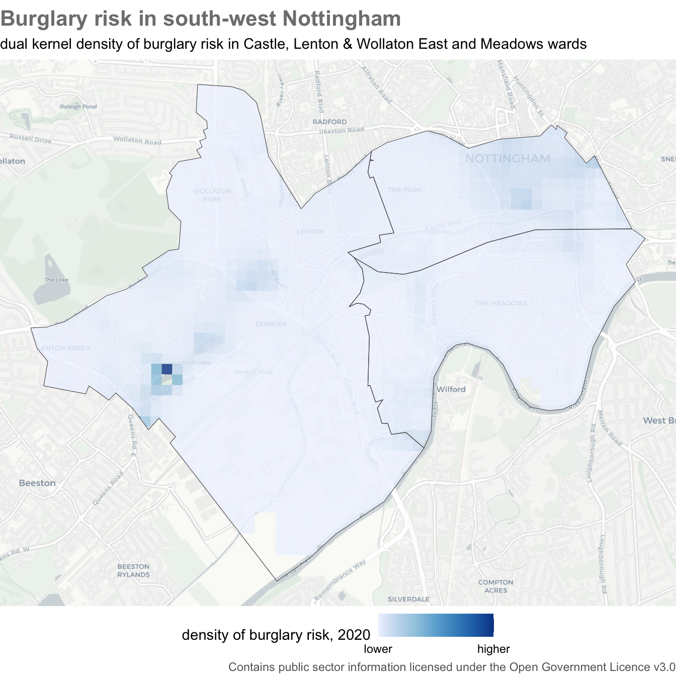 To illustrate making a dual KDE map, we will use reports of burglaries in three wards in Nottingham in 2020. Since the essential element of the crime of burglary in England is that an offender enters a building as a trespasser in order to steal something, the best measure of the population at risk of burglary is the number of buildings in each area (the definition of burglary is more complicated than this, but we don’t need to worry about that here).
