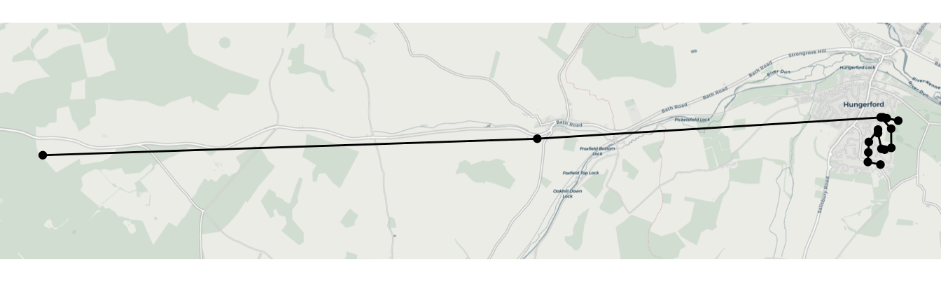 - The straight lines make it look like the offender travelled across fields between locations, which is probably not true. Since we do not have data on what routes the offender took, we can replace the straight lines with curves to indicate that the exact route is unknown.