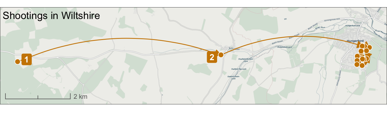 By default, ggplot() works out the limits of the area shown on the map based on the area covered by the data we add to each stack with functions from the geom_*() family of functions. Usually this works well, but in this case the distribution of the shootings means that the map shows only a small slice of the town of Hungerford and the surrounding area. It would be useful for readers to be able to see a larger area, to be able to better identify where the shootings occurred.